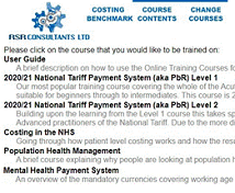 We also have online training courses (Level 1 (with exam) and Level 2 National Tariff, Mental Health, Costing, Population Health Management) available to retainer clients or as a stand alone service for £1500+VAT a year for unlimited users (per organisation). There is also the option for us to create a series of webinars specifically for you so that a range of linked topics can be covered on a weekly/fortnightly/monthly basis. |